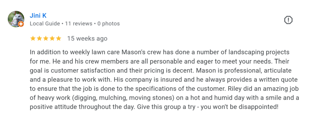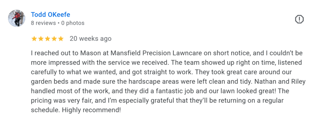 Posted on Julian Leonardo MuñozTrustindex verifies that the original source of the review is Google. Mansfield precision lawn care and landscaping did an amazing job with my lawn, fall cleanup and gutter cleaning! They cleared all the leaves, cleaned out my gutters and left my yard looking perfect. The team is professional, thorough and reliable. Highly recommend for all your outdoor maintenance needs!Posted on Weili ChengTrustindex verifies that the original source of the review is Google. Mason Orr and his team do excellent work. They are friendly and accommodating. We are new and satisfied customers.Posted on Denise SnowTrustindex verifies that the original source of the review is Google. Thank you Mason for a job well done!Posted on Harry FrankTrustindex verifies that the original source of the review is Google. Mason and his crew did a great job removing the leaves from our large yard. They did exactly as I requested including clearing the leaves out on the road in front of our house. I highly recommend his services.Posted on Melica StinnettTrustindex verifies that the original source of the review is Google. Use Mansfield Precision Lawncare and Landscaping! Mason was communicative, and kind and single-handedly removed our gigantic brush pile of bush trimmings and branches collected over the years, which was crucial for putting our house on the market to sell. Many thanks to the great work of Mason and this small local business!Posted on Jason WoffordTrustindex verifies that the original source of the review is Google. the owner and crew are very knowledgeable and passionate about landscaping. Highly communicative and competitive pricingPosted on Kayla GilletteTrustindex verifies that the original source of the review is Google. As a new customer, I wanted to share my experience so far. I had read positive things about this company from in my community Facebook page. When I saw them completing work in my neighborhood, it served as the perfect opportunity to say hello. From that first interaction to the completion of work on my lawn today, I have been impressed! This company takes pride in their work, and it’s done with politeness and professionalism.Posted on SunnyTrustindex verifies that the original source of the review is Google. Mason and Nathan came out to my home to clear out some serious overgrowth. They were efficient and precise (as the company name states)! Took away a mound of debris and left my yard clean. For young guys, they were very professional with a high level of customer communication. They worked with me on pricing by cutting some services I would have liked to have done and we arrived at a price point that I could afford right now while still getting me what I needed to have done right now. Their level of work ethic is not always easy to find these days. I would highly recommend their services. Thank you Mason and Nathan!!Posted on ning xueTrustindex verifies that the original source of the review is Google. I had been desperately looking for a lawn mowing company this summer and Mason showed up and saved me. He is always very polite and responsive. The price is also reasonable too. Glad I found him!Verified by TrustindexTrustindex verified badge is the Universal Symbol of Trust. Only the greatest companies can get the verified badge who has a review score above 4.5, based on customer reviews over the past 12 months. Read more